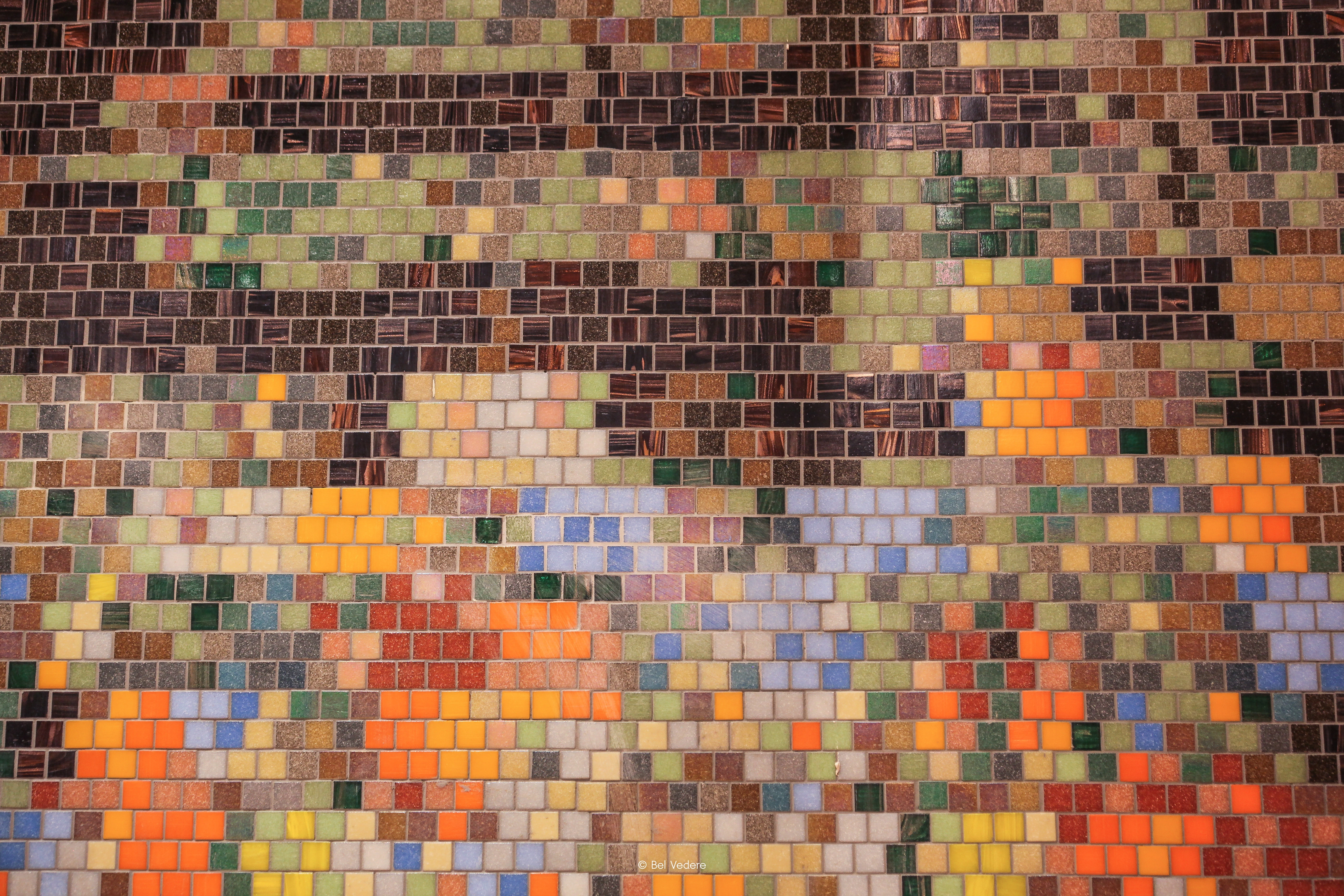 Pixelated Mosaic: At the wall's base, a vibrant geometric pattern—composed of meticulously arranged small glass mosaic tiles in shades of sunset orange, mustard yellow, and turquoise blue—creates a dynamic, amplified pixel effect, radiating energy and modern artistic flair.