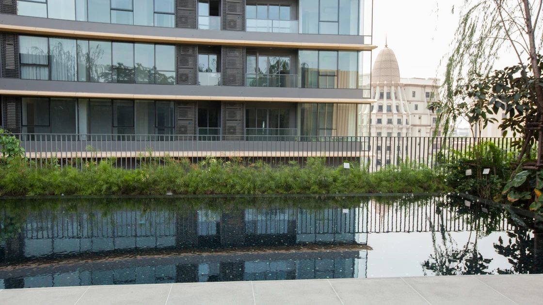 The swimming pool at Lumpini Soho is a masterpiece of metropolitan luxury and artistic depth. Bel Vedere was commissioned to create a pool environment that exudes elegance and mystery. The design features a primary blend of Onyx Black and Earth Brown glass mosaics, providing a deep, sophisticated water tone that mimics the serene stillness of a starlit night.