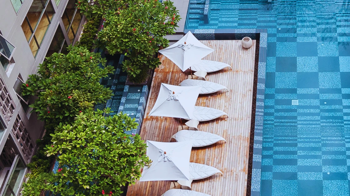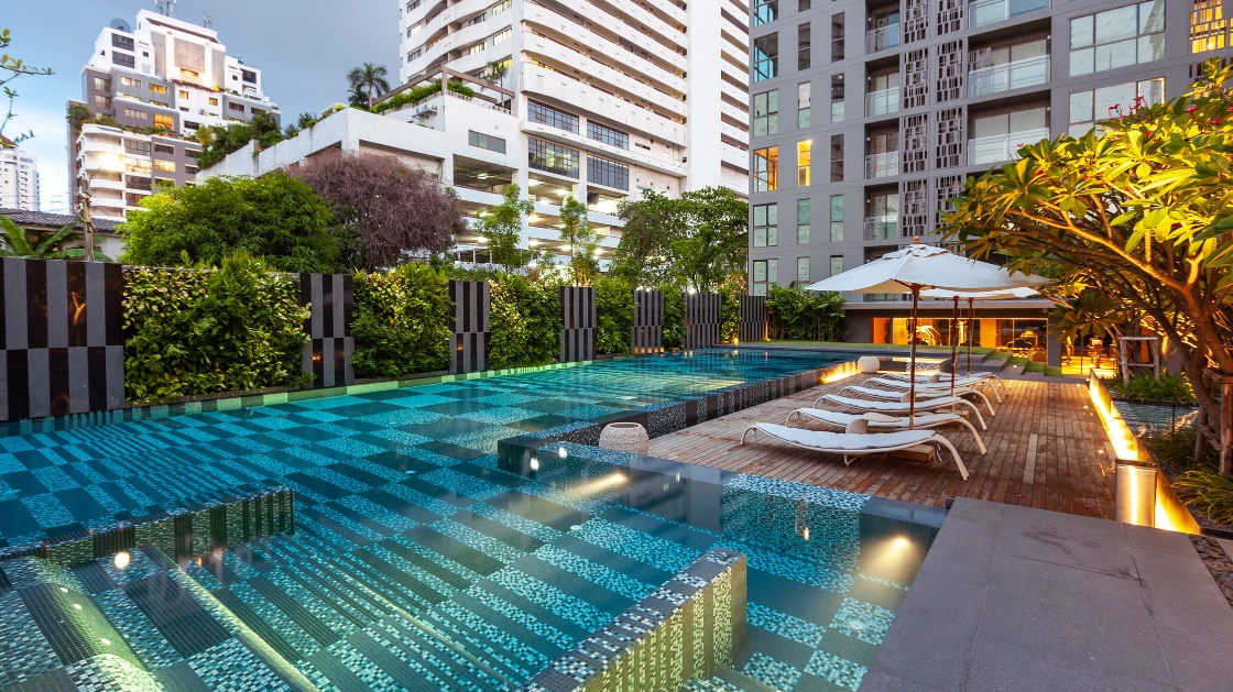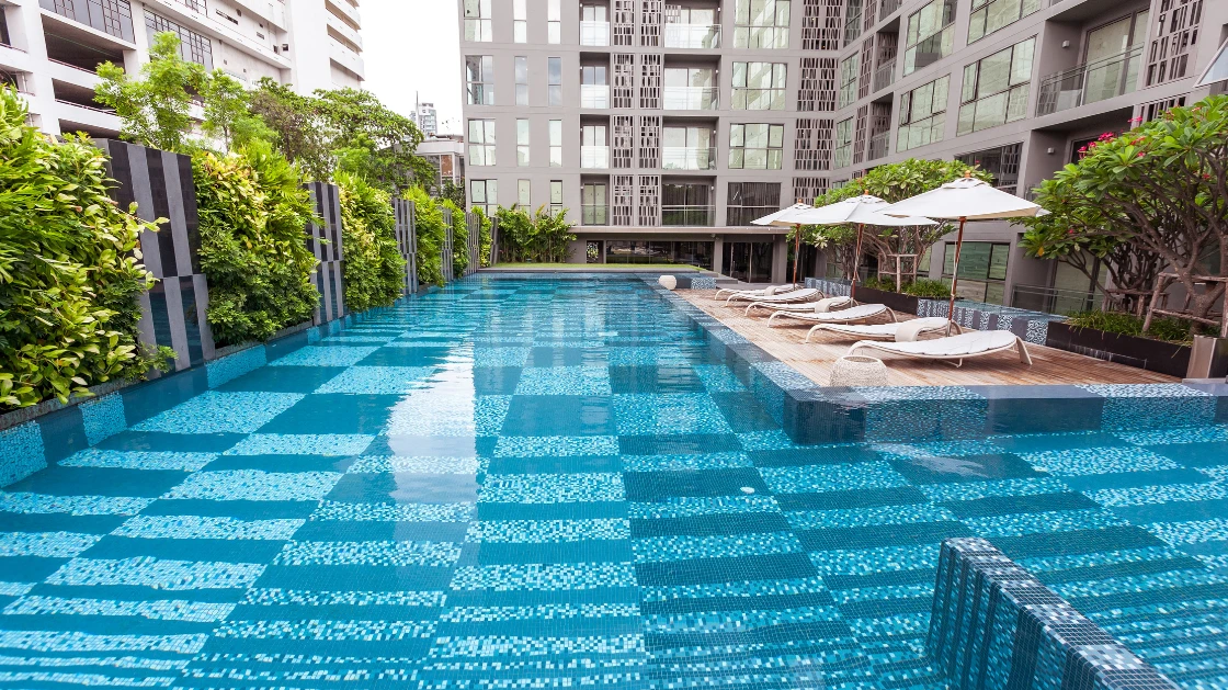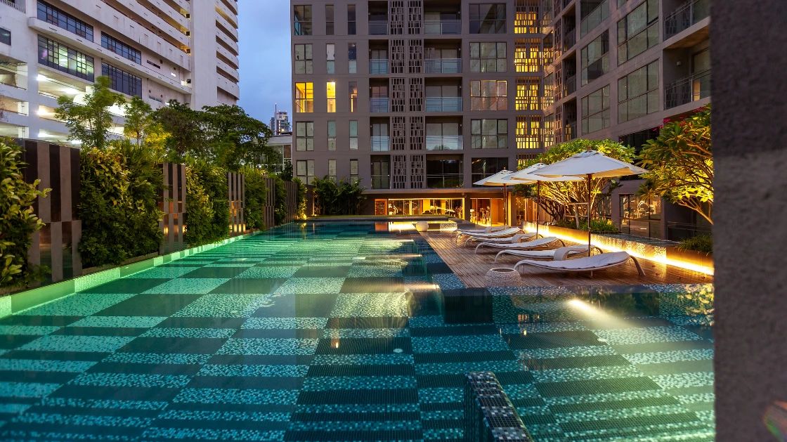 The project features intricate geometric and organic motifs, achieved through precise mosaic placement. Each pattern was carefully calculated to ensure a seamless flow across architectural surfaces, from the serene pool areas to the elegant common spaces. By blending curated tones into specific patterns, we created a "Light and Shadow" effect that mimics the natural dappling of leaves, perfectly embodying the Botanical concept. In this project, the mosaic is not merely a finish; it is a tapestry of luxury that harmonizes urban living with the serenity of nature.