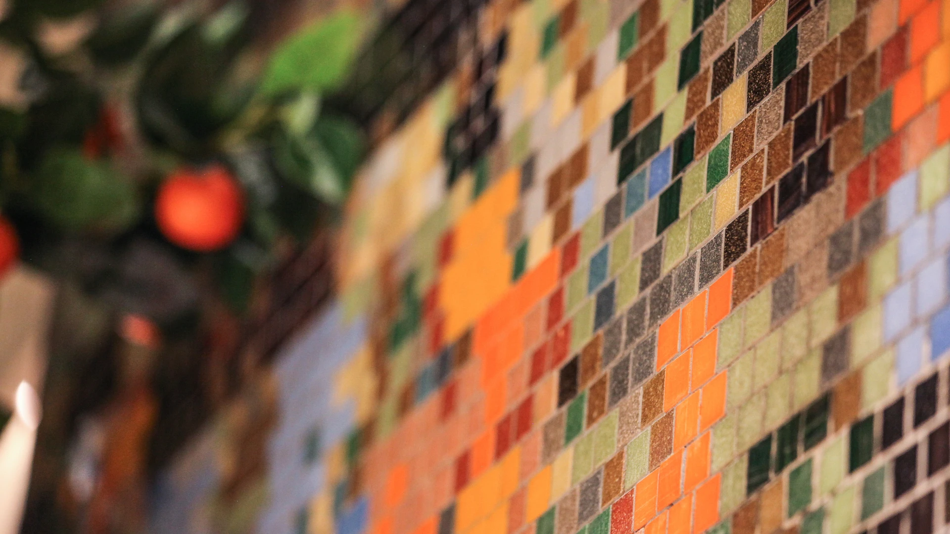 Pixelated Mosaic (การเรียงเม็ด): ในส่วนฐานของผนัง เราใช้โมเสกแก้วขนาดเล็กมาเรียงต่อกันเป็นแพทเทิร์นจีโอเมตริก (Geometric Pattern) โดยใช้โทนสีที่สดใส เช่น สีส้มอาทิตย์อัสดง, สีเหลืองมัสตาร์ด และสีฟ้าเทอร์ควอยซ์ คละเฉดกันเพื่อให้เกิดมิติและความมีชีวิตชีวา (Energetic Look) ราวกับภาพพิกเซลขยายใหญ่
