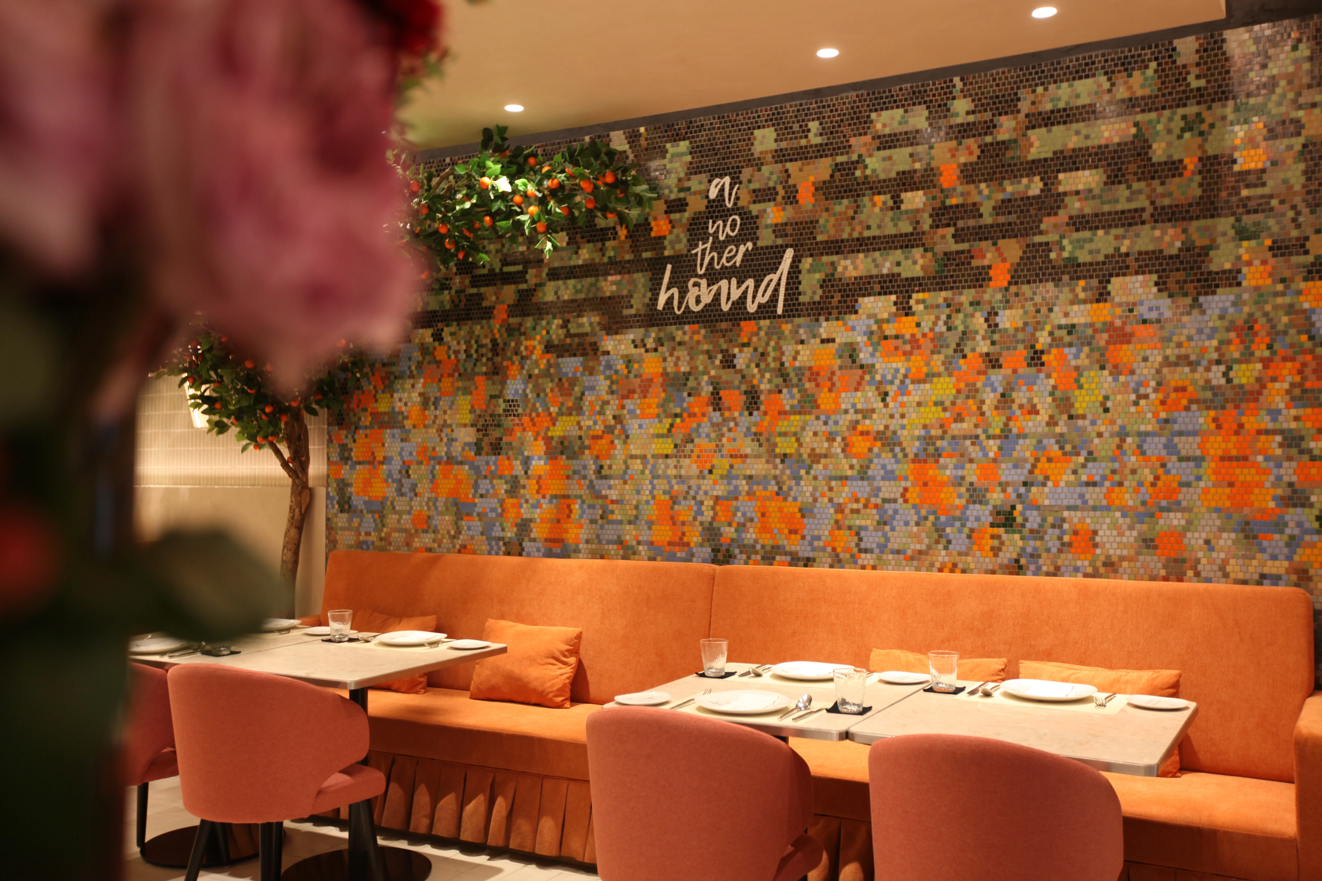 การเลือกใช้สีสันทั้งหมดถูกคัดสรรโดยสถาปนิกอย่างจงใจ เพื่อให้ผนังโมเสกชิ้นนี้เป็นดั่ง "Backdrop" ที่ช่วยขับให้เฟอร์นิเจอร์สีพาสเทลและต้นไม้ประดับดูโดดเด่น สร้างบรรยากาศที่ดูสนุกสนาน ทันสมัย แต่อบอุ่นและผ่อนคลายในเวลาเดียวกัน สะท้อนจิตวิญญาณของ Another Hound ได้อย่างสมบูรณ์แบบ