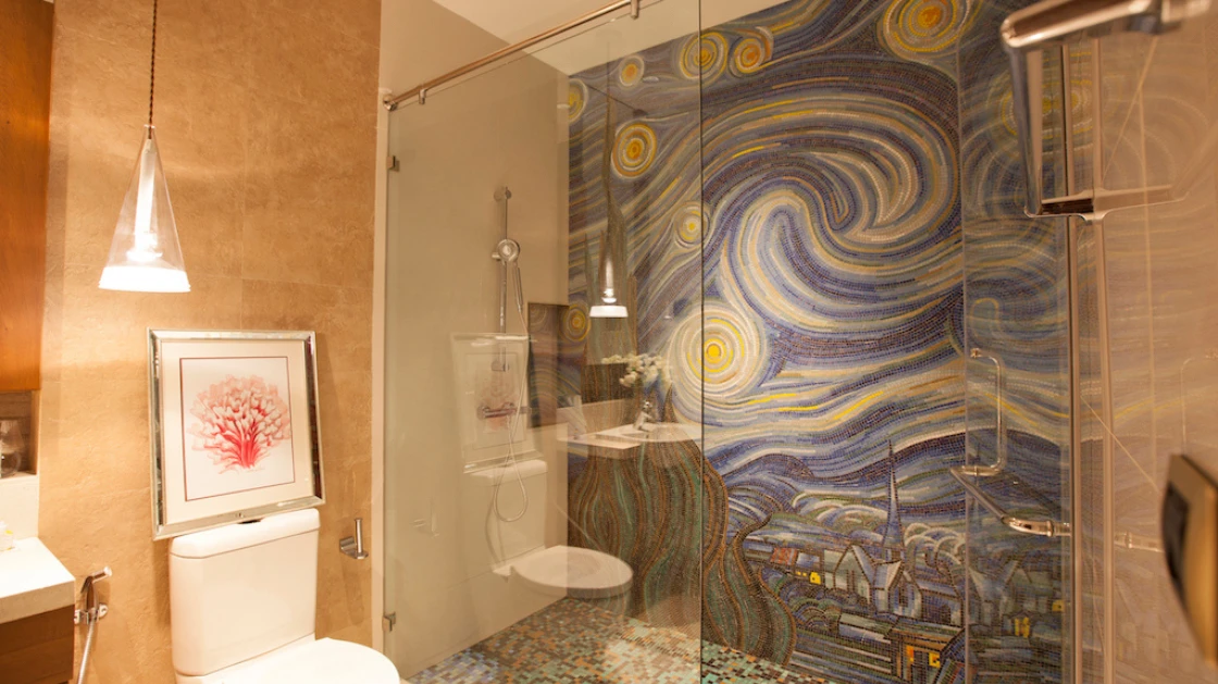 เพื่อให้สามารถจำลอง "รอยพู่กัน" (Brushstrokes) อันเป็นเอกลักษณ์ของ Van Gogh ออกมาได้อย่างสมจริง เราได้คัดสรรเฉดสีของแก้วที่มีความลึกและมิติที่แตกต่างกัน แล้วนำมาเจียระไนอย่างพิถีพิถันเพื่อวางเรียงร้อยให้เกิดความพริ้วไหวและทรงพลัง เสมือนการวาดภาพด้วยชิ้นกระจก ผลลัพธ์ที่ได้คือผนังประดับที่ไม่ได้เป็นเพียงแค่ส่วนหนึ่งของอาคาร แต่เป็นงานศิลปะชิ้นเอกที่มอบคุณค่าทางจิตใจและความสง่างามที่อยู่เหนือกาลเวลาให้กับโครงการ Bright 24