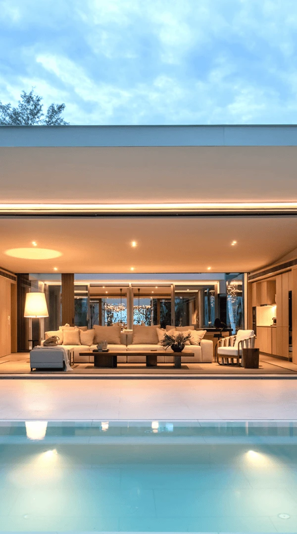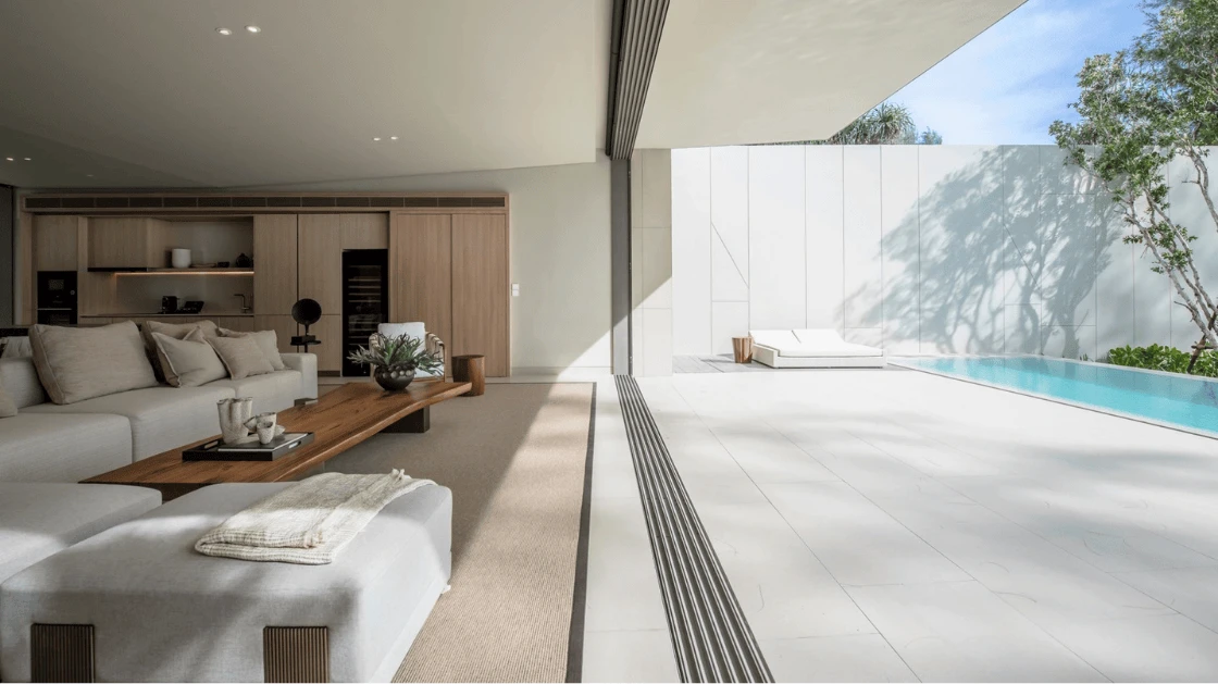 Total Visual Integration: การใช้ลายหินเดียวครอบคลุมทั้งพื้น ผนัง และสระว่ายน้ำ ช่วยสร้างความรู้สึกที่มั่นคงและเงียบสงบ (Monolithic Look)